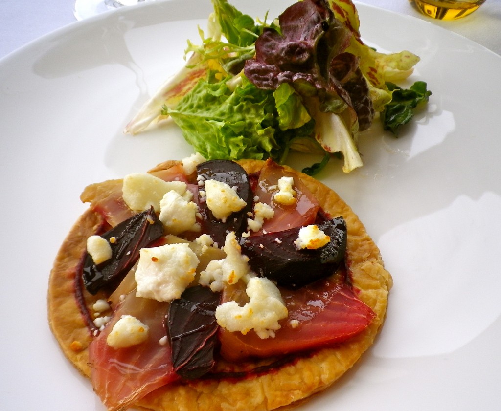 The lunch food menu, titled ‘Market Menu’ is clear and succinct with a varied selection of seasonal dishes. To start we ordered the Pumpkin Veloute with truffle ricotta and pine nuts and the Tart Fin of beetroot, crumbled goats cheese and wafer thin croutons. The tart was light and delicious, the ideal starter; the cheese mild and crumbly, the flavour contrasting nicely with the sweet soft beetroot, salty pastry and vinegary dressing. My sister almost licked the bowl, she enjoyed her Pumpkin Veloute so much! It was intensely flavoured and incredibly wholesome with no cream, just pumpkin and some careful seasoning.