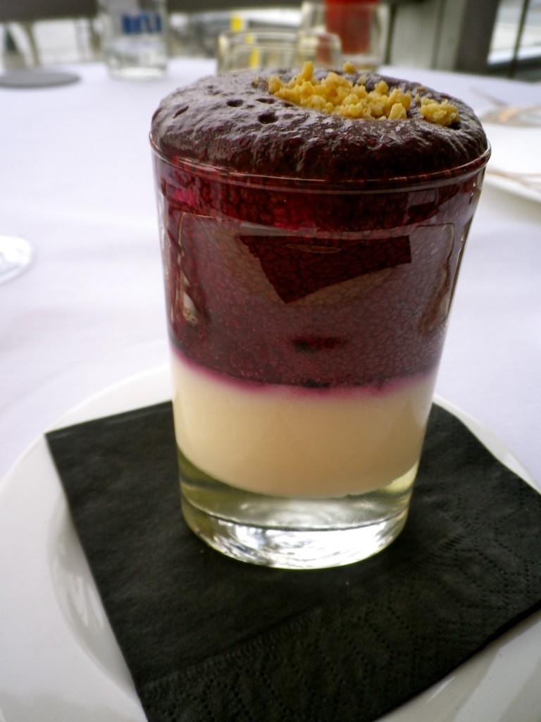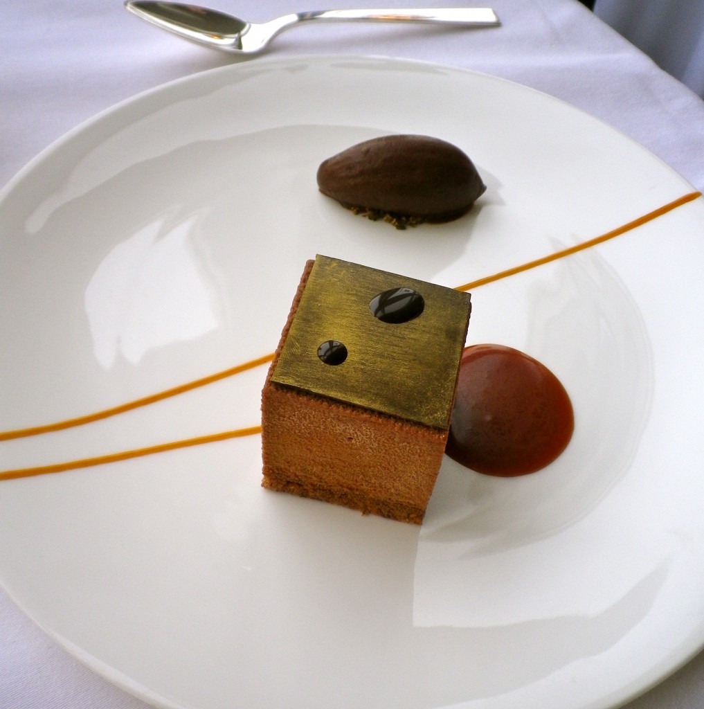 Scanning the restaurant, we could see various diners receiving their special little petit fours, beautiful circular stands with little sweets, we rushed through pudding eager to receive our treats. An avid fan of pannacotta I chose the Elderflower Jelly, lemon grass Pannacotta and blueberries; it arrived stylishly layered in a glass, an interesting mix of flavours though there were a few too many blueberries and not enough creamy pannacotta. For my sister, our waiter kindly arranged a chocolate dessert from the evening menu, an amazing chocolate and caramel torte mousse, velvety and delicious.