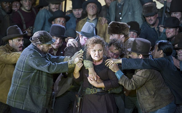 To think of Puccini’s operas is to be transported to the Orient, the Latin Quarter of Paris and to Rome. But when the curtain at the ENO was raised on the scene of a bar in the middle of Goldrush California, the audience stirred in their seats. When a cast of nearly 40 males crowded onto the stage moving with slick gun-slinging choreography and excellent solo performances, the audience were thrilled and carried away by the story. And when Susan Bullock, the ENO’s new Minnie in The Girl of the Golden West made her powerful entrance onto a stage crammed full of hearty male voices, the audience were entranced by her authoritative and formidable voice. Needless to say, this was not your typical Puccini performance. The last ENO performance of this lesser known opera of Puccini’s was over 50 years ago and the performances, direction, set design and general production proved to be well worth the wait.
