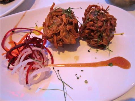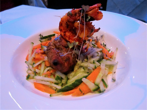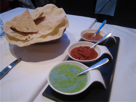The extensive menu offers inventive and intriguing dishes, some familiar Indian favourites, others totally unrecognisable. We opted for a selection from the reasonable lunch menu (two courses for £20, three for £25) and the a la carte. I enjoyed an exotic yellow cocktail, expertly mixed and wonderfully presented in a saucer glass. A basket of poppadum shards arrived, with varied colours and flavours they looked as good as they tasted, enhanced by an amazing spicy tomato shrimp chutney.