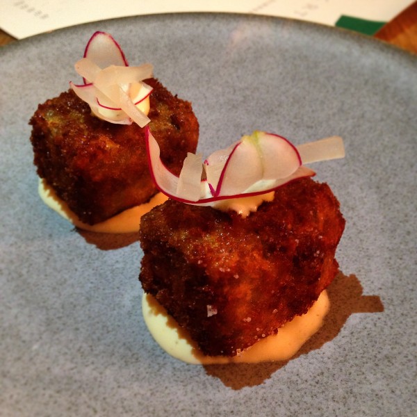 Chef Merlin Labron-Johnson previously worked in a Michelin-starred restaurant in Belgium before joining the kitchen at Portland. His inventive recipes use unusual ingredients and they are slickly executed. We were sat brilliantly close to the open kitchen, nearby to the vintage jars of home pickled vegetables. We started with the delightful Pig’s head croquettes balanced on a dollop of kimchi mayonnaise. Rich and moist meat with a salty crunchy breadcrumbed exterior and a luxurious dip, it was the perfect combination.