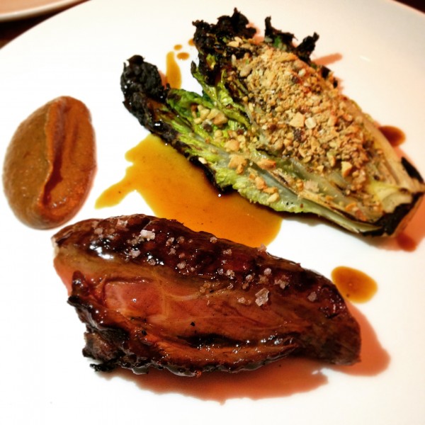We created a meal with an assortment of smaller dishes and a main. The chef’s interest in foraging was evident in the heritage carrot dish, where attractive varying shades of rustic vegetables are presented upright in a bed of puree. They had a lovely roasted caramelised flavour and were paired with shaved nutty Mimolette Vielle cheese and crunchy seeds. Charred brassicas were luscious green stems with a smoking egg emulsion (similar to Hollandaise sauce, but lighter), soy and Perigord truffle, an original recipe with oriental elements, and miraculously worked very well. For main course, the Fallow deer is a rich and glossy piece of meat, too rare for me but with a lovely crispy edge.