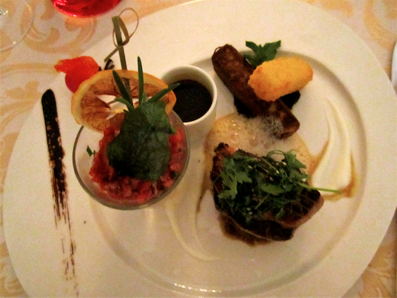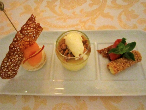 The mains were even more elaborate and each plate contained a plethora of components. There is no doubt that the presentation here is beautiful though whether these intricacies were for show or taste I was not always sure. For main I opted for the rich ensemble of beef, cooked three ways. Fresh steak tartare presented in a glass, a mini beef fillet cooked in butter and tagine-style beef breadcrumbed and gently fried. Each variant was carefully prepared and presented with delicious additions like a huge potato chip and sweet warm gravy! The fillet was my favourite – a high quality cut of meat that was tender and flavoured with herby, peppery marinade. My friend tried the Monkfish… there were some slightly bizarre pairings here, a small strawberry smoothie shot was yet again presented alongside the fish, very strange and not altogether enjoyable! It was a fine piece of fish though, meaty and fresh however the serving was again far too big.