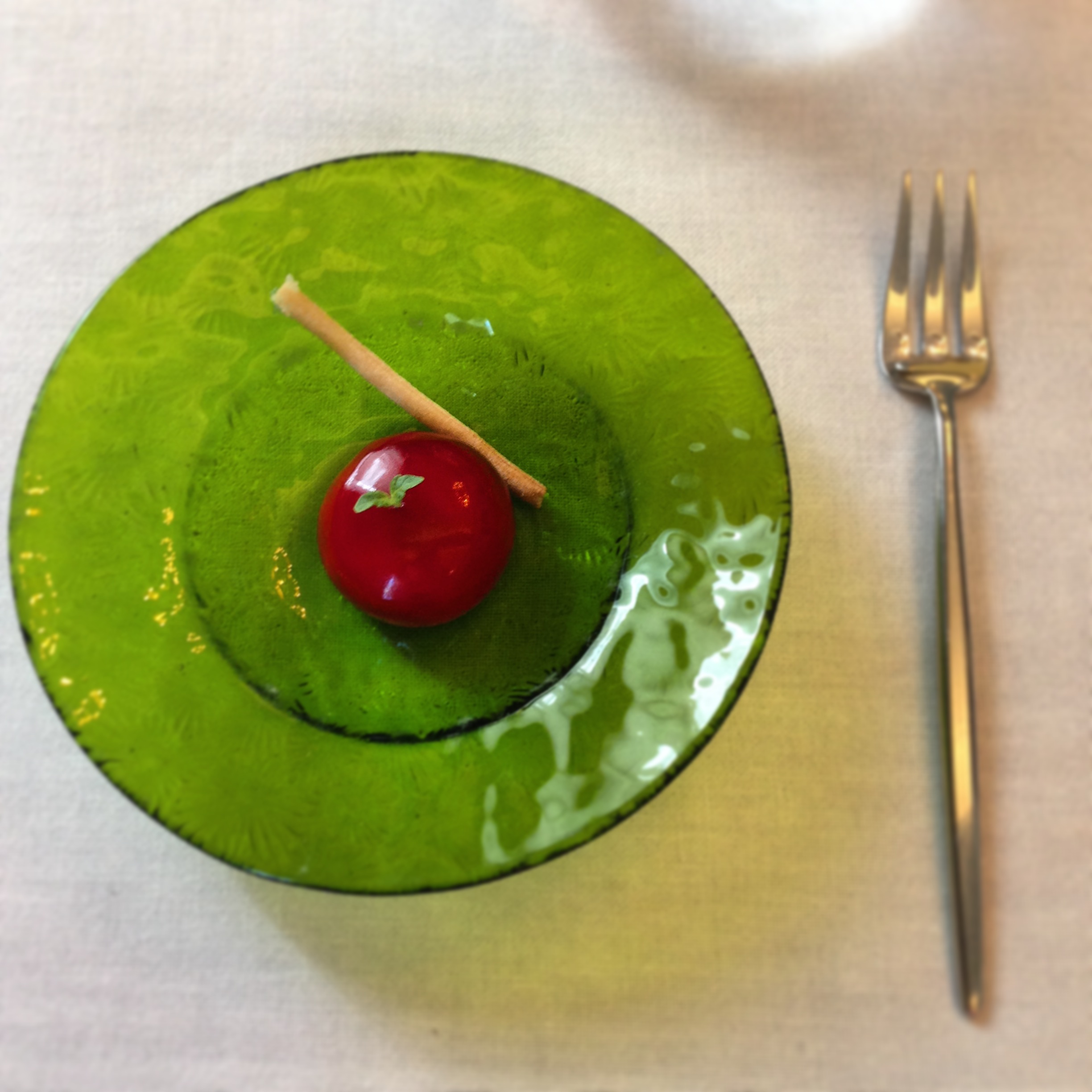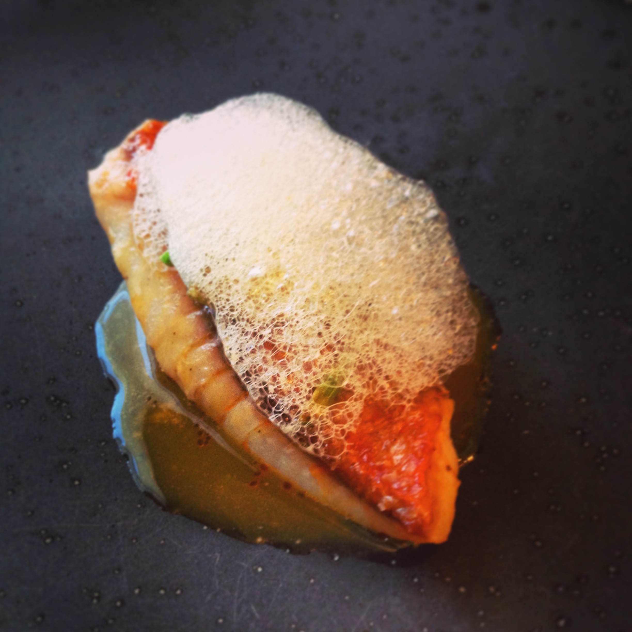 The dishes employ numerous experimental techniques and clever twists – it is impossible not to smile as the food is presented and explained. Not all is as it seems. In our first dish, game is made to look like a truffle with a strong meaty flavour and soft smooth texture on a bed of grated rich foie gras, displayed in a purpose made glass structure cleverly designed to allow smoke to waft out around the food. It was a mysterious and exciting start to the meal. Mini Babybell cheese was an elegant recreation of the classic kids snack, a gooey truffle scented cheese centre encased in red gelatine outer shell. Each was just a mouthful or two, but the flavours were complicated and mesmerising. At every stage, carefully considered Spanish wines were served to complement the food.