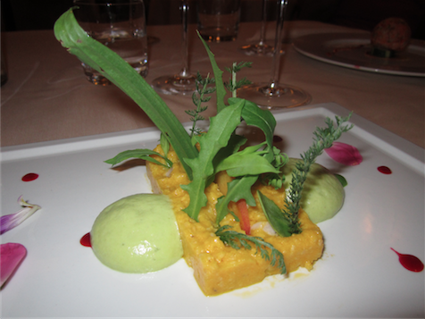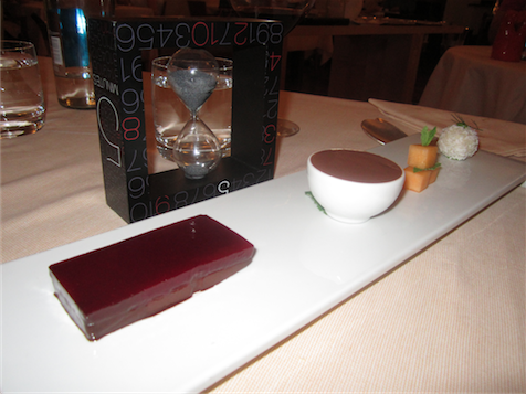 Both puddings required persistence; they certainly aren’t your average fine-dining sweets. ‘Five Minutes’ is a terrine of chocolate and raspberries, raw-food water-based chocolate mousse, coconut truffle melon and lemon balm en brochette, a strong and particular palette of tastes. Aspects were delicious though I couldn’t help thinking it could do with a dollop of thick cream! ‘To your health!’ is the ultimate fruit feast, a sugar-free cake with a plum and almond base, figs and cashew pastry, with peach and rosemary sorbet… it was an explosion of colour and vitality, and was certainly the healthiest dessert I have ever tried.