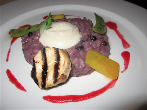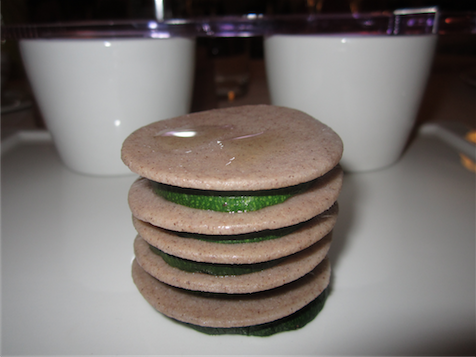 Blueberry risotto was bizarre yet oddly tasty… a bowl of blue rice with bell peppers, sword beans and eggplant; the eggplant and peppers giving weight to the dish while the blueberries offered colour and sweetness. ‘For Gavinda’ was arty and interesting, a pasta pile of buckwheat layered with zucchini doubloons was prettily presented with two sauces on the side; peas with lemon zest and potatoes with Lombard curry was a great combination of flavours and textures but it was a shame that it came lukewarm rather than hot.