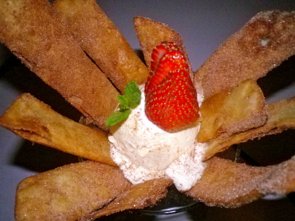 I have never experienced a Mexican dessert so was curious about Benito’s offerings… annoyingly our first choice, the Flan Casero (a fluffy type of crème caramel) was not available so instead we ordered one portion of bunuelos to share with a final cocktail. This was an unexpectedly delicious recipe, crispy strips of tortilla coated with sweet cinnamon and sugar and served with cold vanilla ice-cream and a decorative strawberry. The tortilla was extra fresh and crunchy thickly covered in the heavenly sweet mixture, particularly nice after dunking in the ice cream.