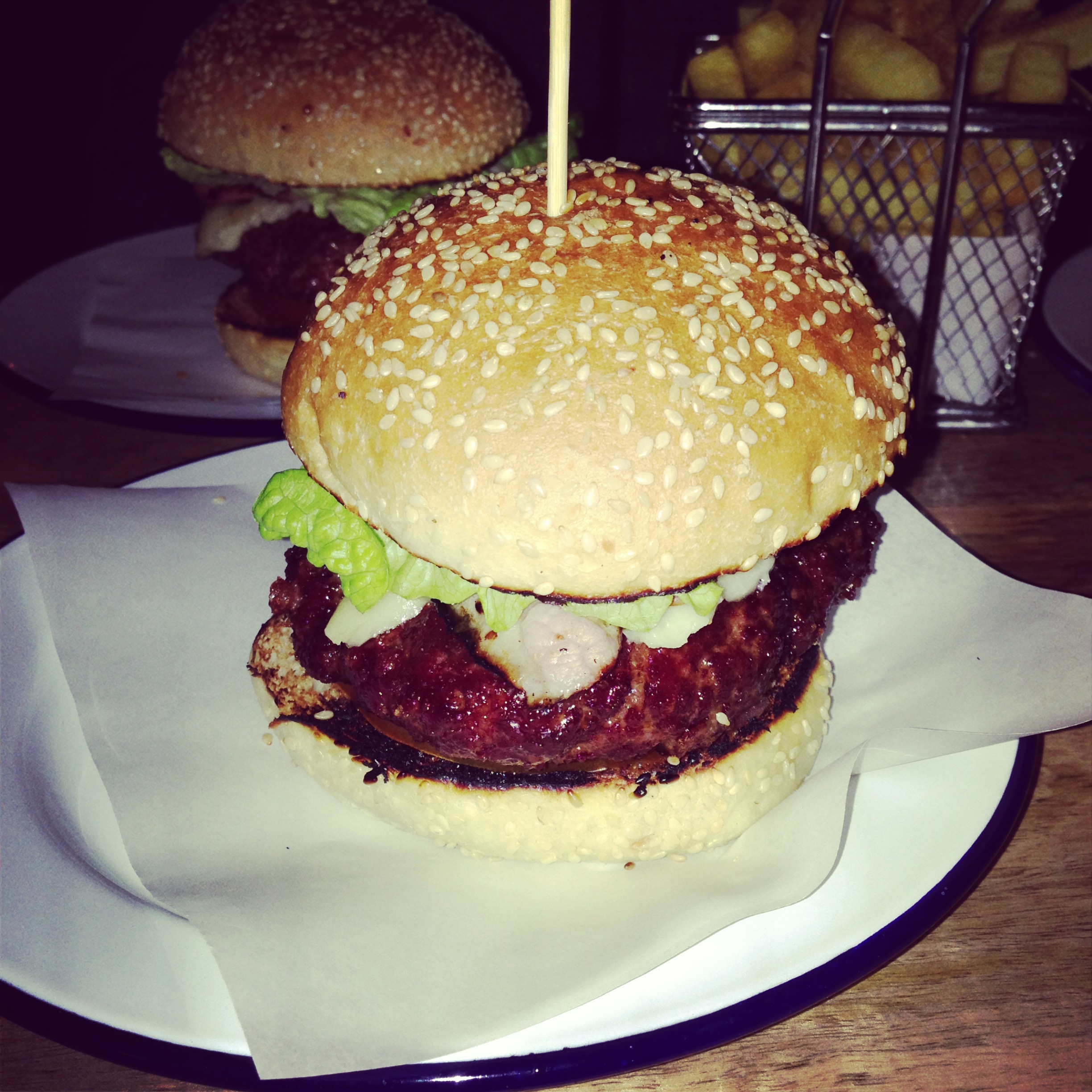 In retrospect I wish I’d tried the sliders instead of the full blown burger. £10 gets you a trio of miniature handmade bitesize sliders with varied and eccentric toppings. Instead we both chose the classic Dach & Sons burger, £10 for a single or £18 for a double whammy. Made from short rib meat the patty was dry and bland, the gruyere cheese and smoked lettuce helped a little but on the whole it was very unsatisfactory. Fries (I’d call them chips as they are pretty chunky) are triple cooked, vacuum dried and made utterly indulgent with beef dripping.