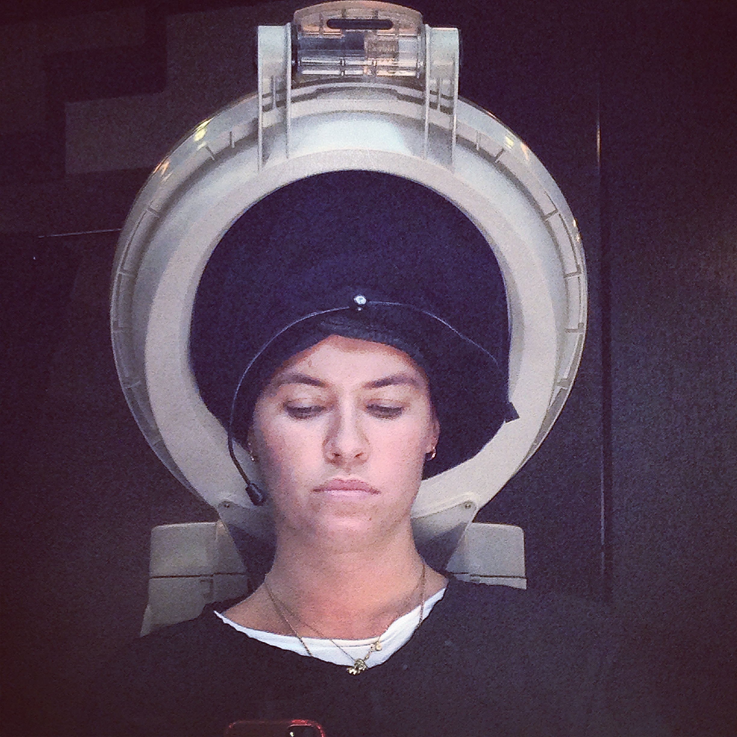 After a brief consultation with hairdresser Hannah and colourist Jade we decided on my ‘look’ and the girls got to work. Jade began by applying dark dye to my roots to create a contrasting base then she worked methodically through my hair, picking out random strands to lighten and highlight. After a brief period letting the dye and bleach develop, I was taken over to the basin (and massaging chairs) for a rinse and treatment. The Micro Mist treatment is left on the hair for approximately fifteen minutes within a heated steam helmet! This lovely treatment adds moisture and strength to the hair and leaves the strands extra shiny and soft.