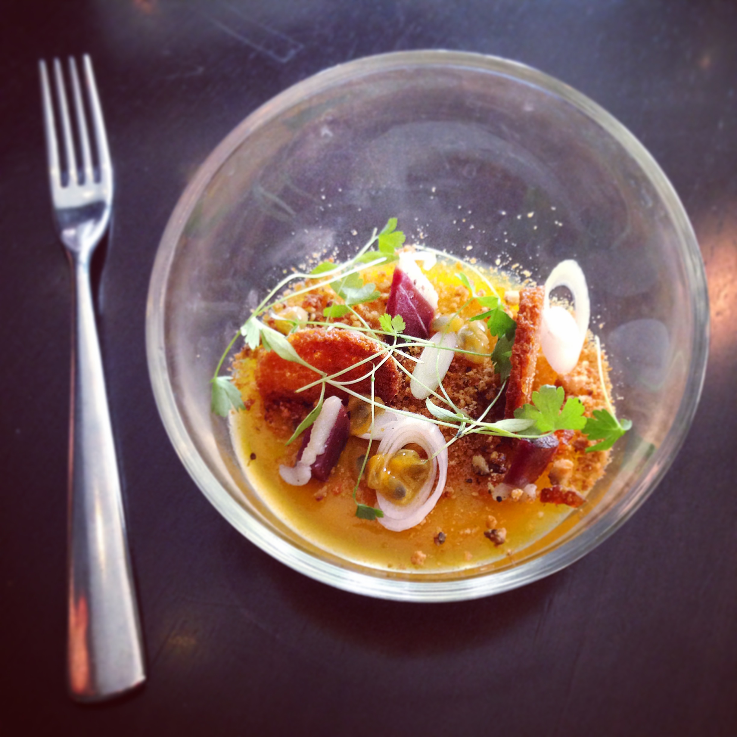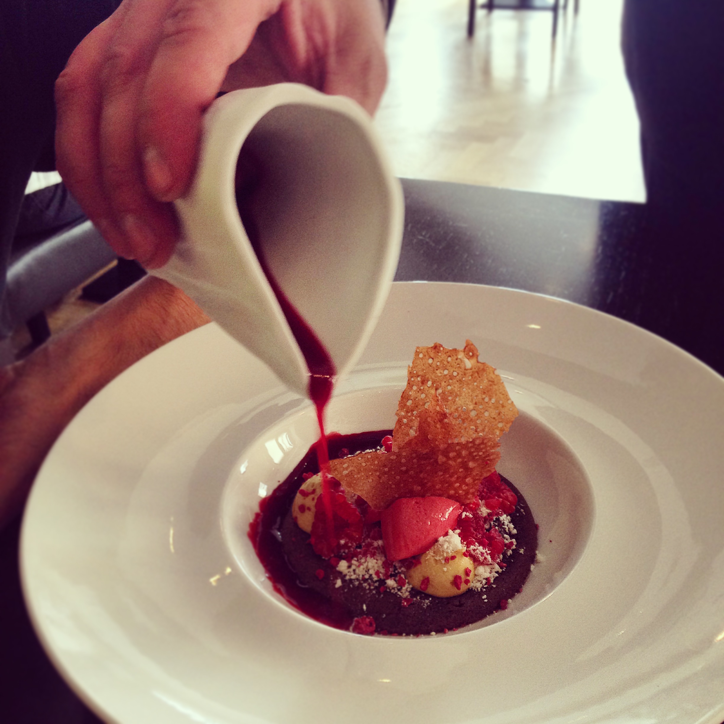 After a surprise course of superior cheeses, we chose desserts. After watching the pastry chef decorate plates in the kitchen, I was extremely excited to taste the whimsical creations. We obviously picked the chocolate option, Fondant with raspberry and caramel (an absolute must) and for the second pudding went out on a whim with BBQ Orange Parfait, mojito and liquorice. They both looked beautiful, precariously poised on their platters. I was taken aback by the BBQ orange, sharp and a little bitter, the contrasting components are definitely unexpected, but after getting used to the unique palette of the dish I began to like the refreshing flavours. Chocolate fondant was delicious with a vibrant ruby red raspberry coulis.