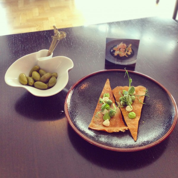 We were seated at the best table overlooking the kitchen, so throughout the meal we could spy on the chefs preparing the immaculate plates. It was great fun to see the foodie performance before the carefully constructed dishes were delivered to us. Prior to our chosen a la carte courses we were offered fluffy warm freshly baked bread, and mouthfuls of crispy pastry with pea shoots, feta and lemon. Then came the tiny tasters of butternut squash veloute with pickled mushrooms and pumpkin seeds, a silky comforting soup and a taste of the culinary delights to come. The sommelier kindly selected suitable white and red wines to go with our food choices.