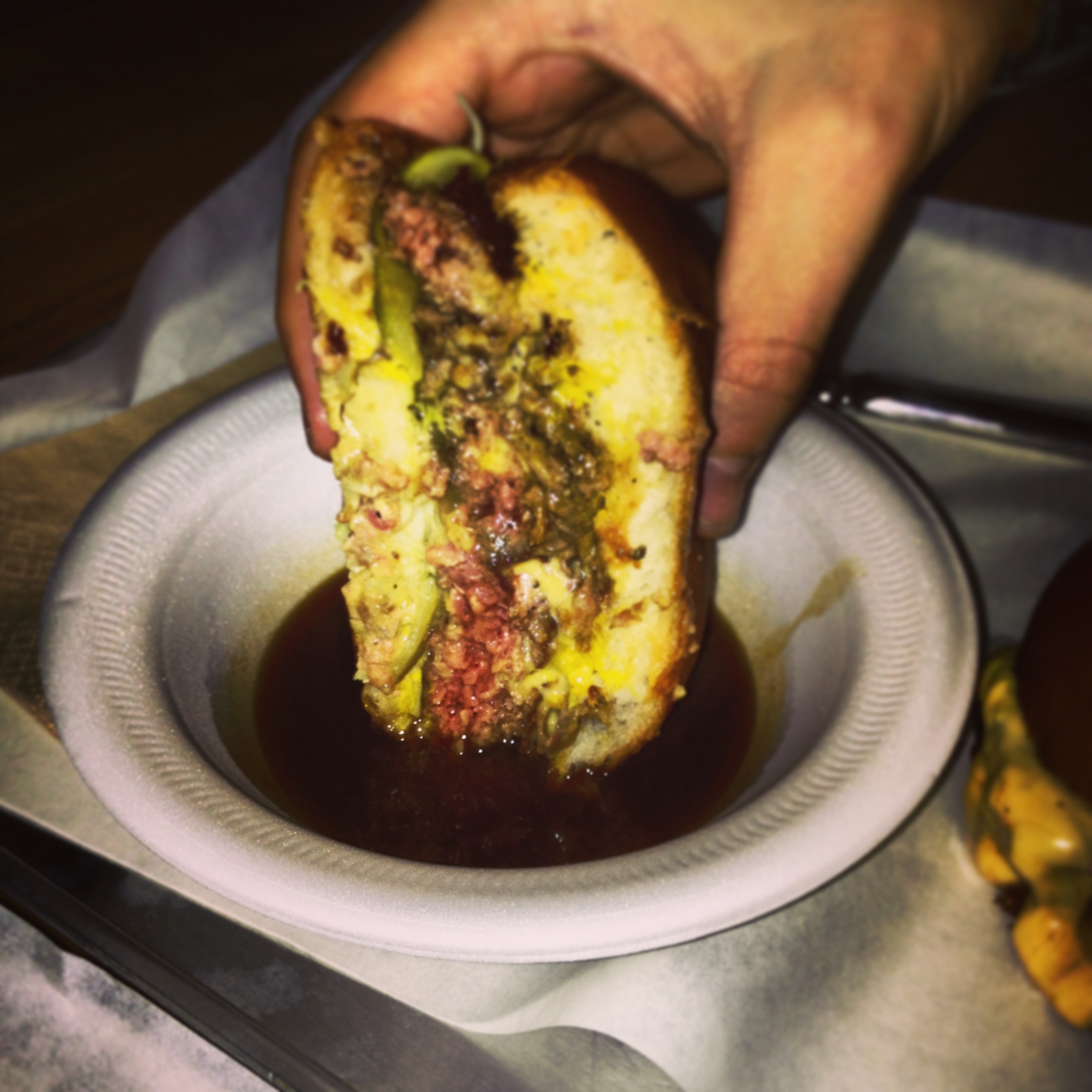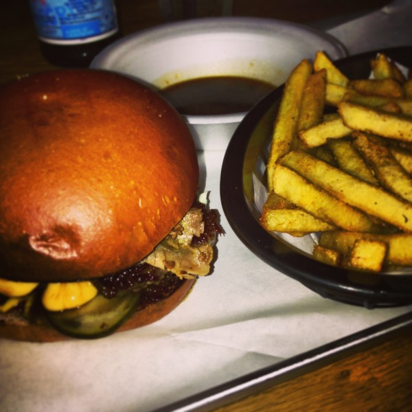 The accompaniments are simple: chips come coated in paprika seasoning, delicious but a little too salty. There is the option to have them coated in cheese; I bowed out of this challenge. In retrospect I wish I’d ordered a side salad to counteract the meaty indulgence though I imagine anything fresh would wilt in such a fatty environment.