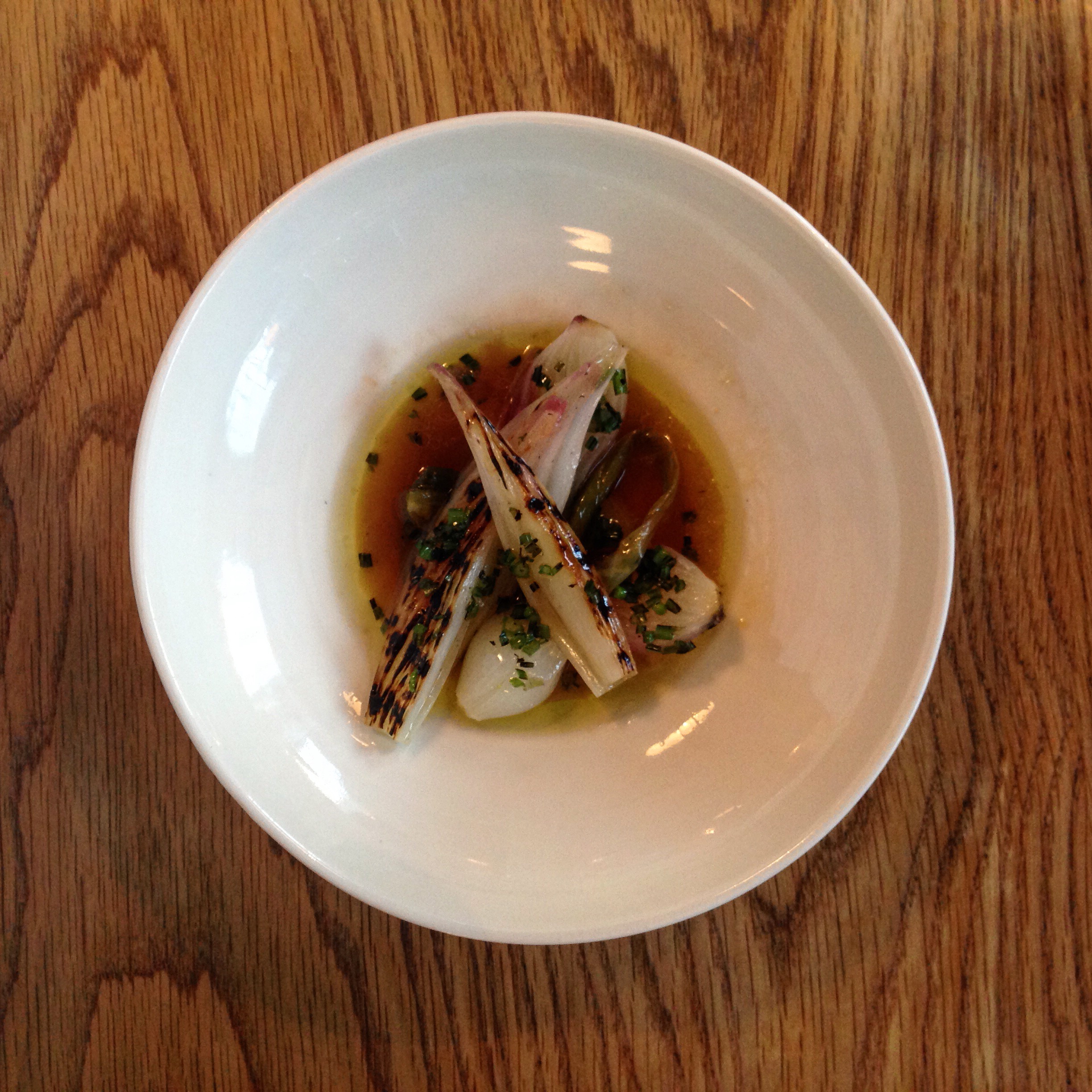 Due to my fish aversion I tried a combination of the standard and the veggie menu and every mouthful was delicious. After crusty sourdough bread and dandelion-yellow whipped salted butter, we ordered a carafe from the reasonably priced wine list. Several extras were placed on the table: Italian lardo (cured pork fat) and peas still in the pod – in the stark white room all the food looked bright and beautiful.