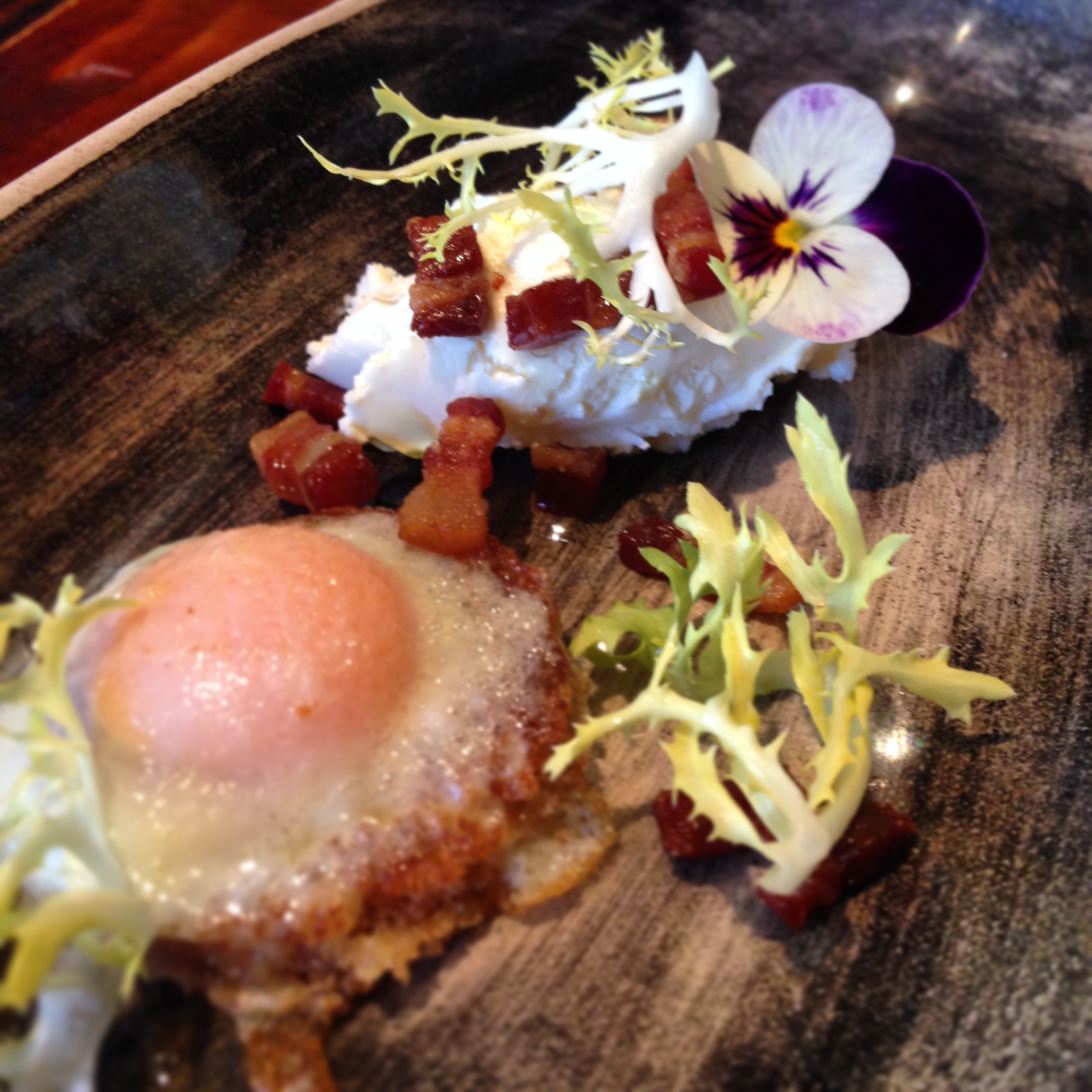 Goats cheese mousse, frisée aux lardons and quail egg toastie