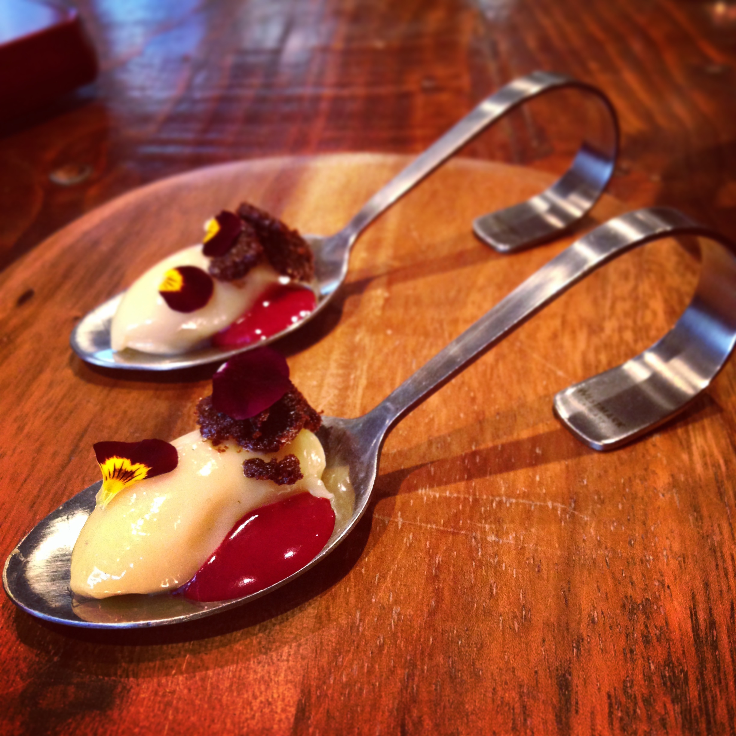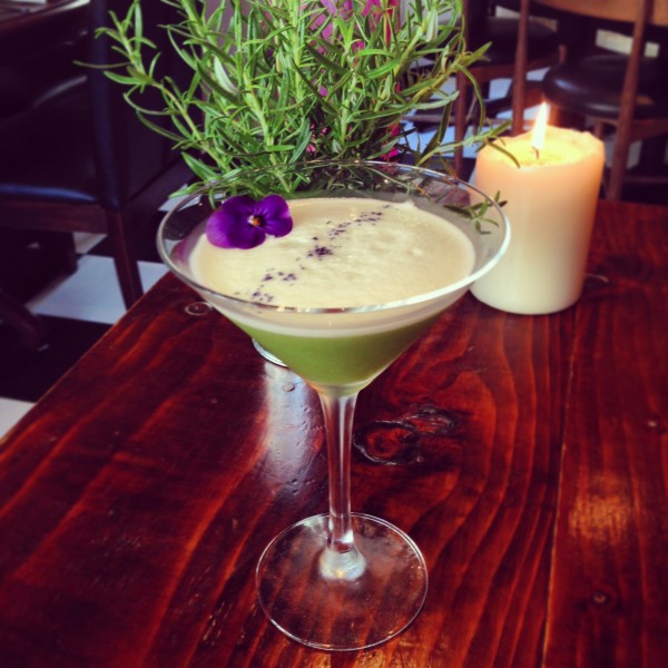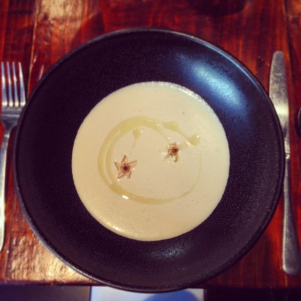 With less than twenty covers, this restaurant serves its visitors with the utmost care and attention to detail. Each table is dressed with a different herb pot plant (we had rosemary) which pleasantly scents the air. I intended to not drink, but couldn’t resist the unusual gin concoction… a lovely combination of Hayman’s gin, sorrel, violet sugar, egg white, freshly pressed apple and lime juice. It was the most beautiful cocktail, a martini glass filled with healthy looking green liquid with a creamy top, sprinkled with purple sugar and adorned with an edible flower.