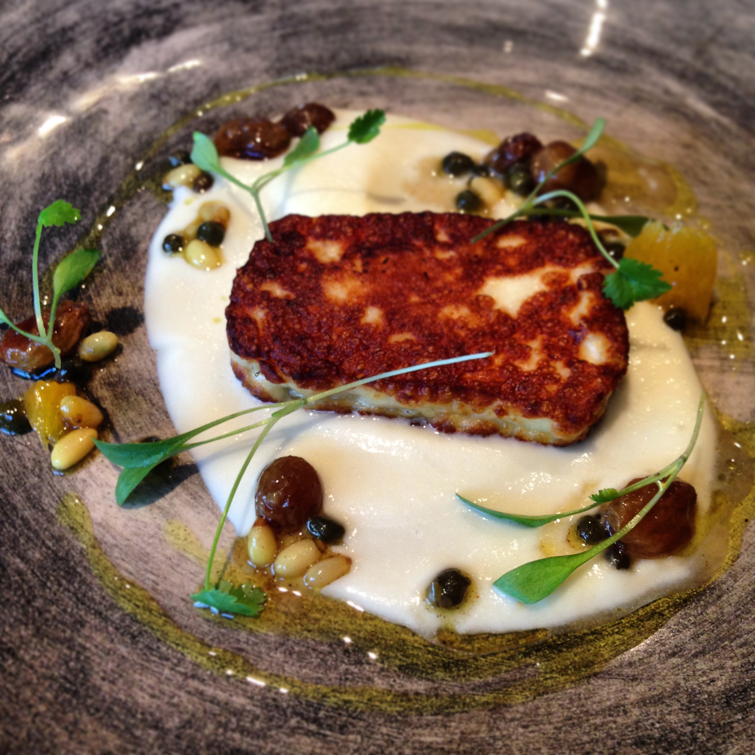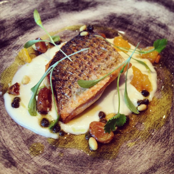 Grey mullet, cauliflower purée, curry oil, pine nuts and sultanas