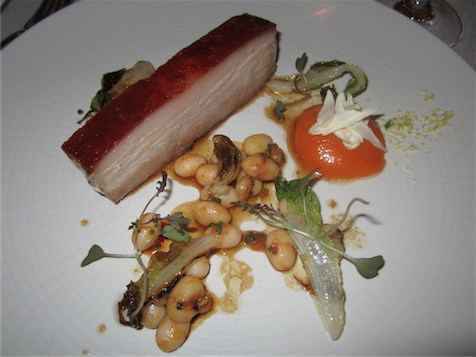 We chose Pork Belly – with fresh white beans, apricots and xo sauce – and Sicilian courgette veloute, crushed tomatoes and goat’s curd. The pork was light and perfectly seasoned for summer with the sweet apricots and salty xo sauce. I was disappointed to discover my courgette veloute was cold, but cannot deny the subtle and delicious flavour.