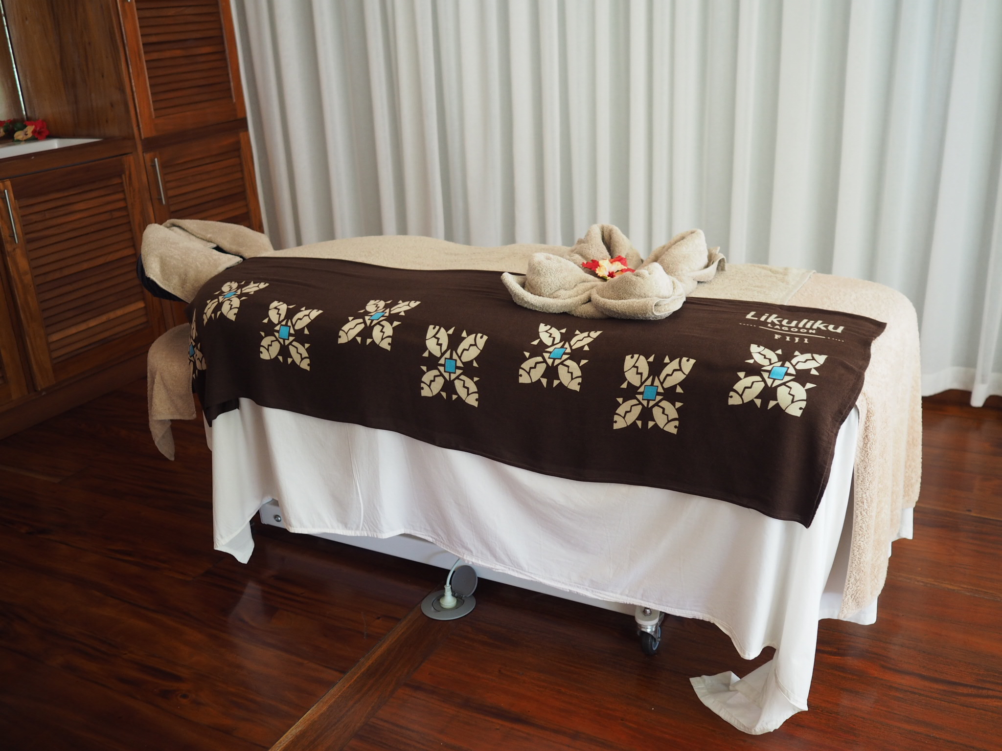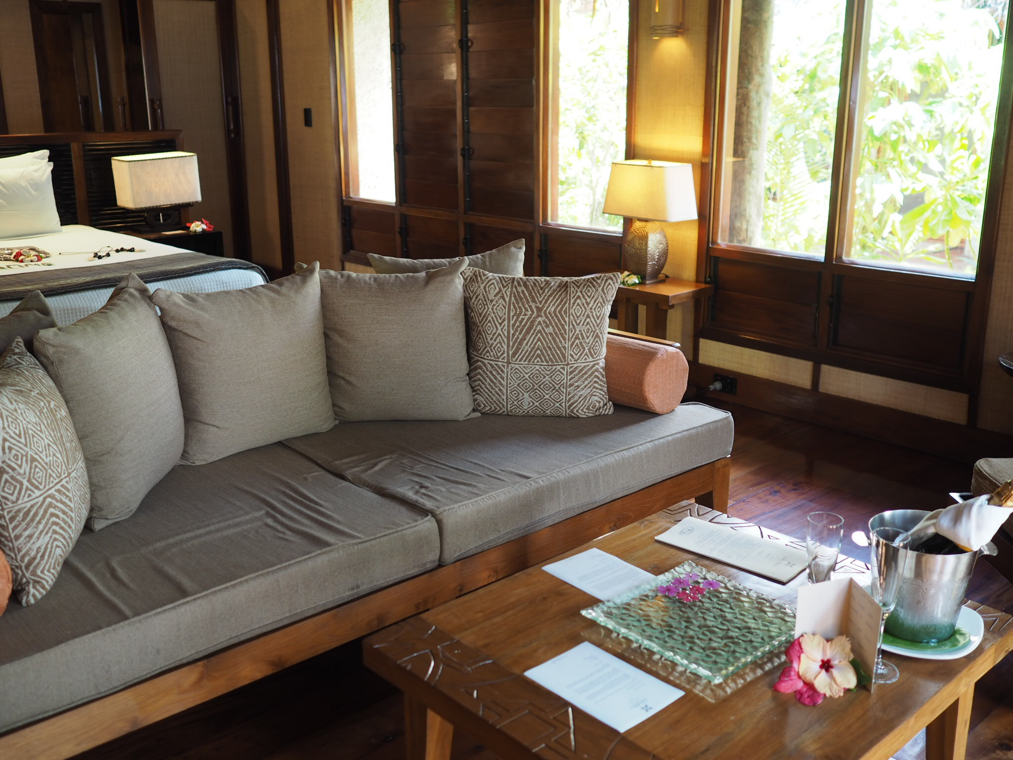 There are 45 rooms, including Fiji’s picturesque, only overwater bures. The other rooms all open out onto the beach, and deluxe rooms include a private plunge pool. Carefully designed to replicate the look of a traditional Fijian village, the individual huts are made with natural materials and decorated with unique pieces of furniture and art from the South Pacific. The dark, warm, patterned wood in the bedrooms creates an inviting and cosy sanctuary to rest your head. The bathroom is indulgently large with a duo of sinks complete with personalised his-and-hers toiletries by Pure Fiji. There is a powerful rain shower inside and a second shower outdoors. In the living area an ice bucket with a bottle of champagne awaited our arrival and on the bed there were complimentary branded sarongs and a Likuliku survival kit of essentials (suncream, aftersun, natural insect repellant and lip balm).