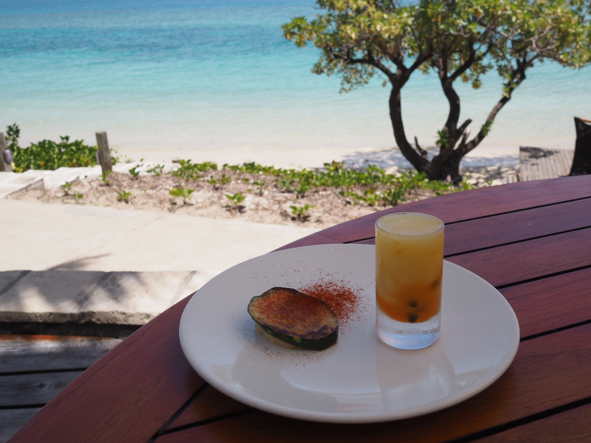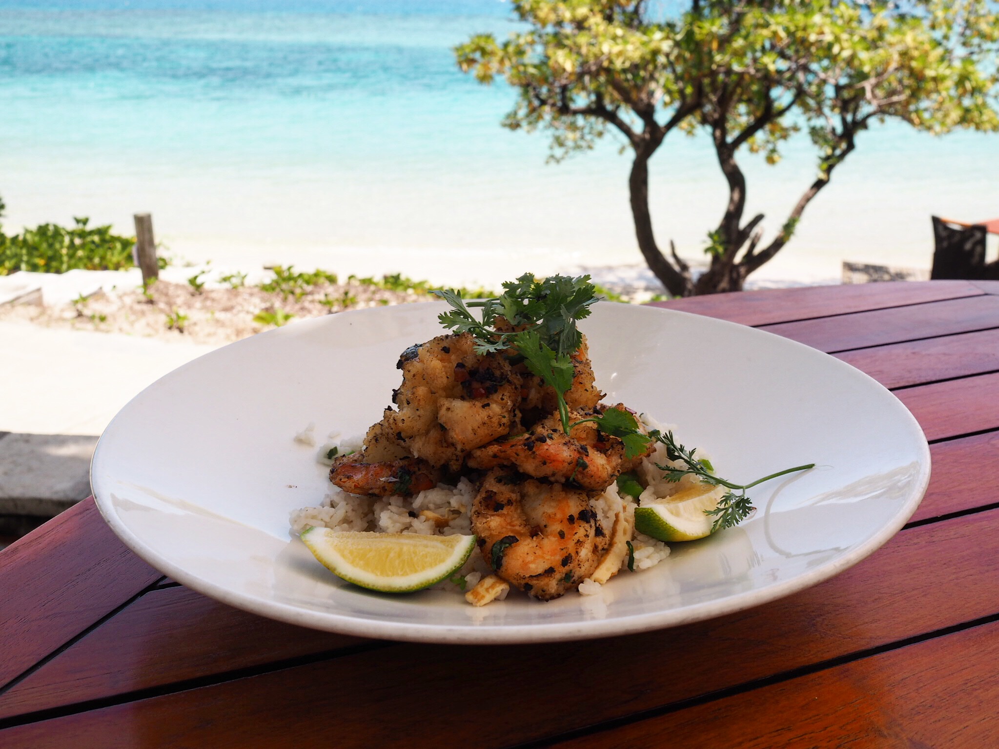As a guest on an isolated island, the options for mealtimes are limited, and so it makes sense that all food is inclusive in the room rate. I found myself looking forward to every meal, to taste Shane’s latest dishes. At breakfast I always indulged with light and fluffy, freshly made buttermilk pancakes with apple & vanilla compote, honeycomb and mascarpone, but the speciality mud crab omelette is also a must try. From the buffet there are numerous appetising treats to choose from including a make-your-own juice bar, assorted pastries and fresh young green coconut juice. Lunch plates were light and tasty, and the recipes often have an Asian twist. My favourite was the charcoal grilled chicken with green papaya, cherry tomatoes and toasted shallots.