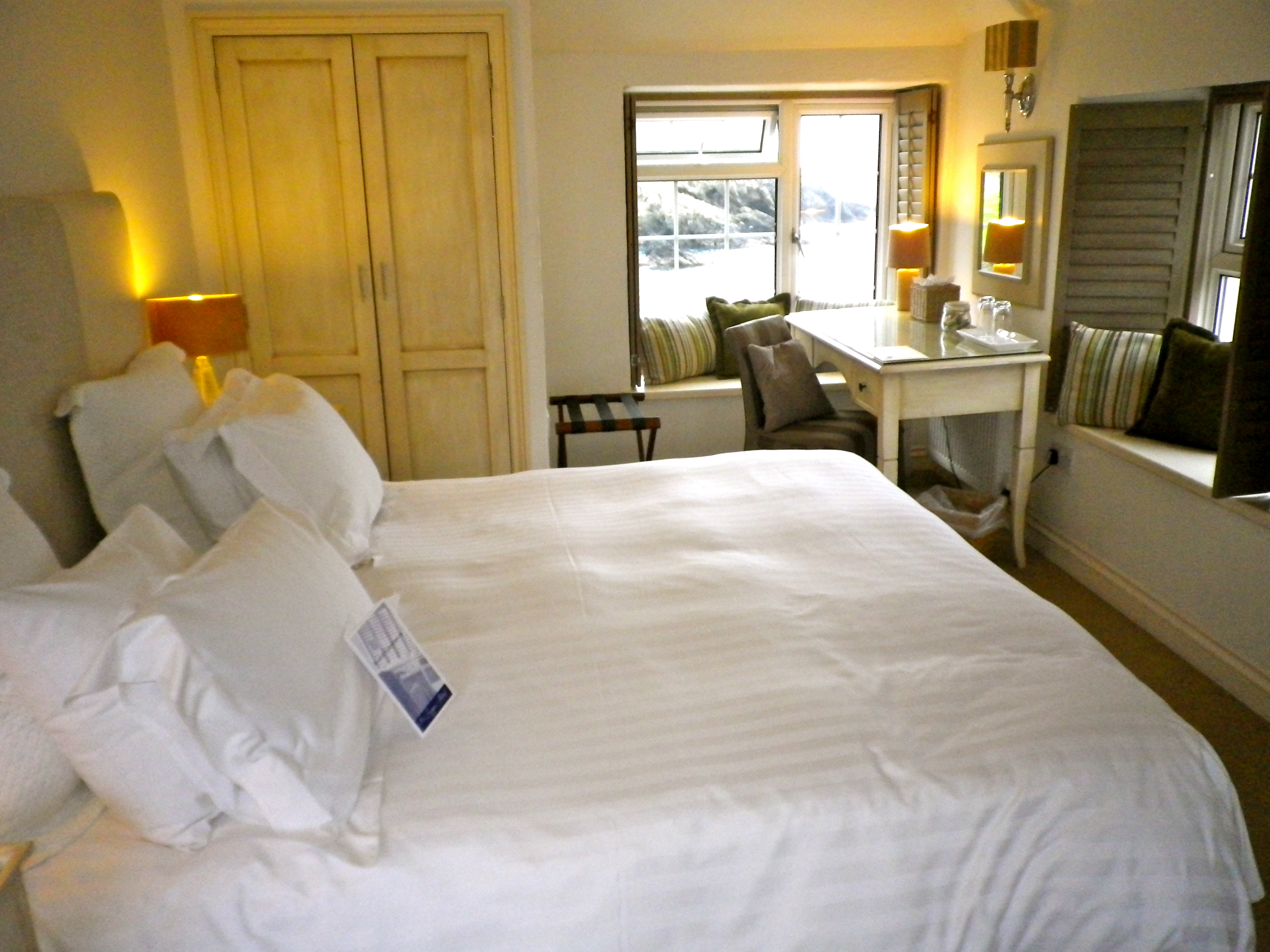The Lugger’s thoughtful touches make one’s stay memorable from start to finish. When we arrived back at our room after supper, I was amazed to see the bed remade and two glasses with marshmallows and hot chocolate waiting to be devoured. The giant bed was lined in gloriously soft linens with plump pillows, the type of bed you may never emerge from, as it is just too comfortable to even consider rising. The sea calms and lulls you into a deep and immersive sleep… just what I needed. With the gentle murmuring of the water outside our window I slept that night better than ever before.