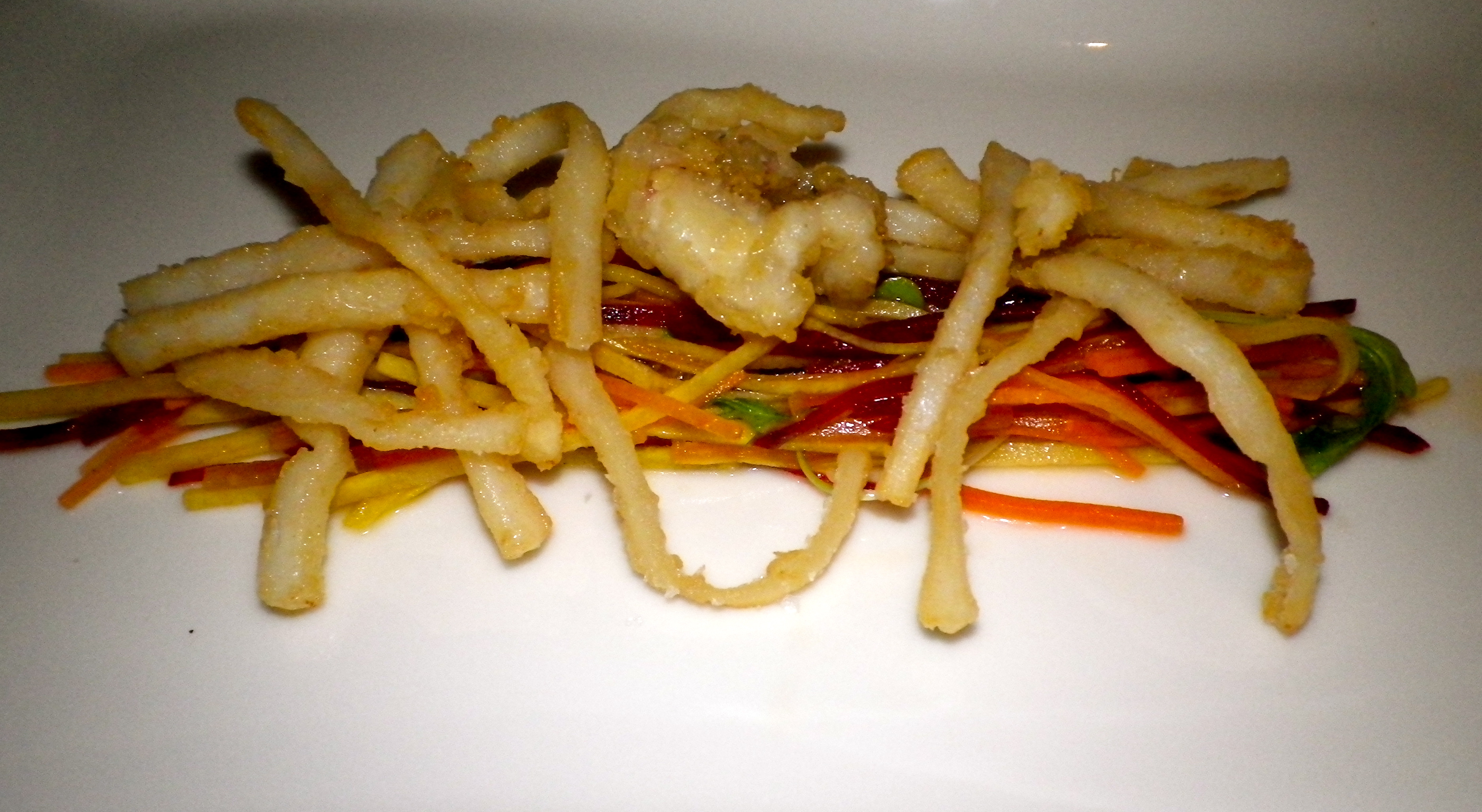 The food is good enough to rival a Michelin starred restaurant… delicately presented but rich in flavour and taste, I could not fault it. We chose from the regularly changing menu of seasonal dishes, carefully compiled to promote the fresh ingredients. Starters arrived on extra hot plates, artistically arranged. Rotolo of butternut squash, cream cheese and pesto for me and Crispy squid with sweet chilli and vegetable salad for my friend. The dishes were composed with flair and great attention to detail, I savoured every bite. My rotolo was a vibrant mix of flavours, the sweet crunchy butternut squash and soft creamy cheese. I tasted the squid – it was divine, the thinnest crispiest battered morsels with an equally yummy salad.